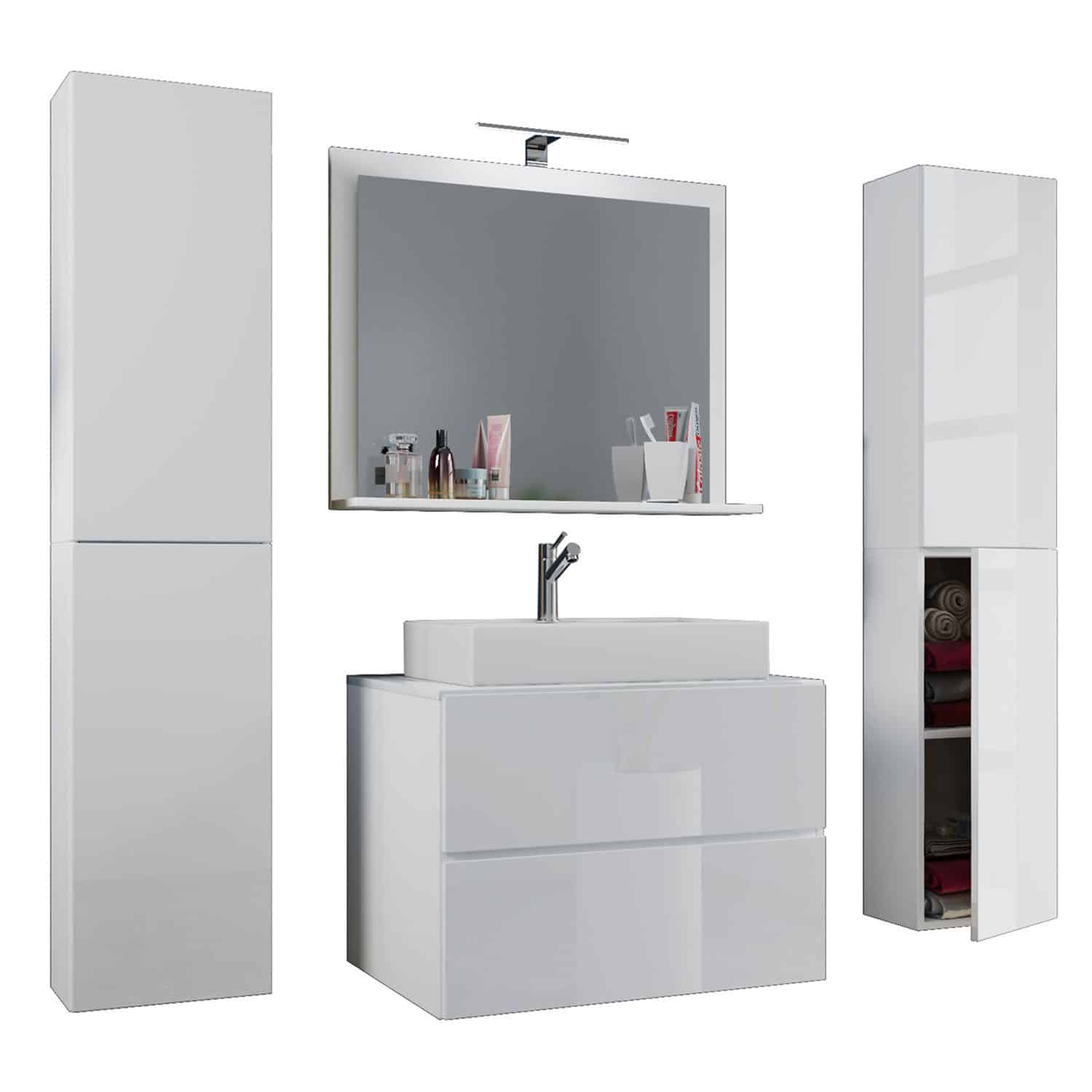 Sættet består af to højskabe, et underskab med en håndvask og et vægspejl.
